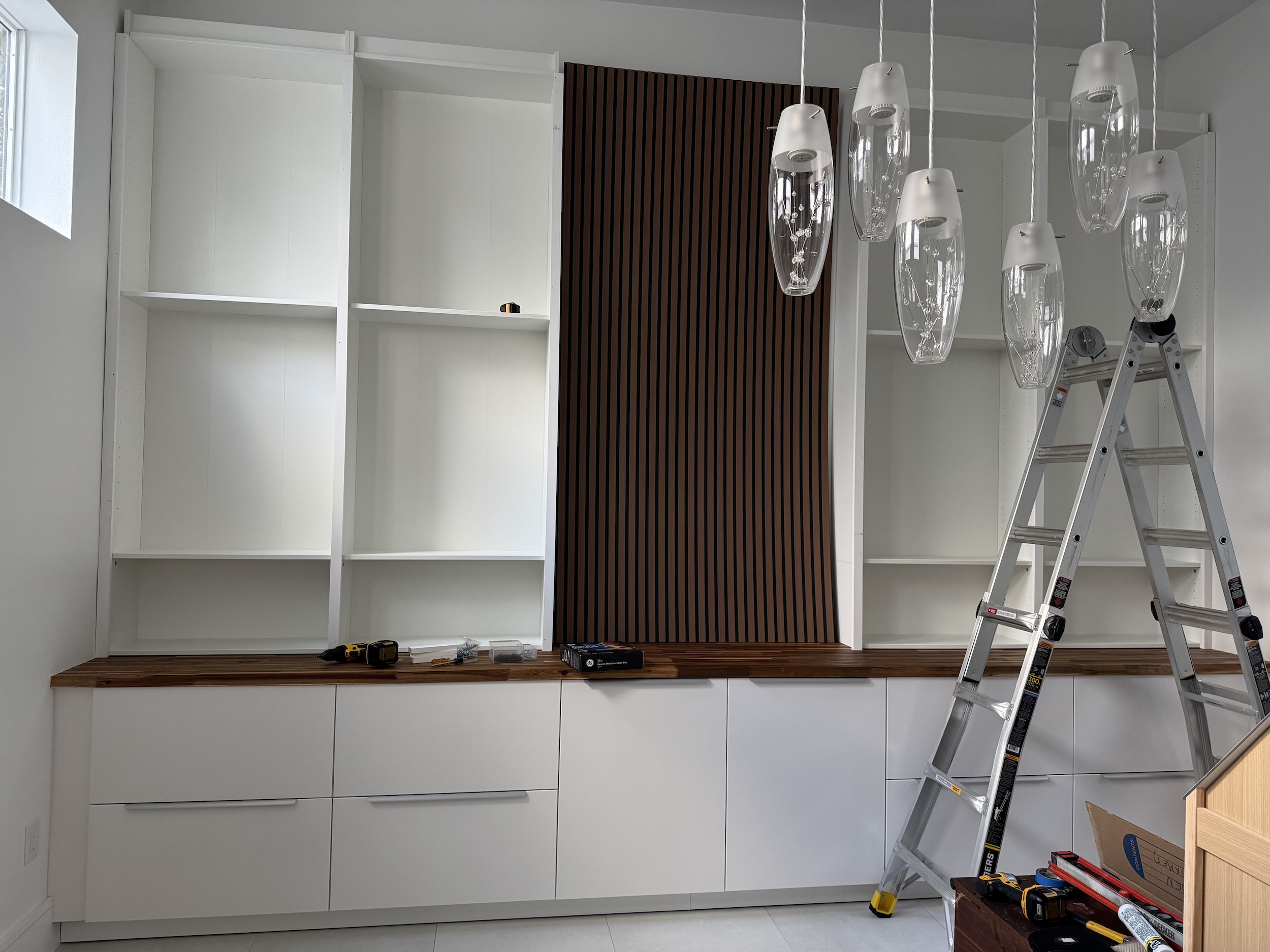 For the countertops, we considered engineered quartz to match the kitchen, but thought butcher block would look better in the room when paired with the wooden ladder. We first looked at IKEA’s Vrena countertop, but learned that all of IKEA’s butcher block countertops are now just veneer over MDF. For the exact same price as the Vrena, we chose a solid-wood Acacia Butcher Block from Floor & Decor.
